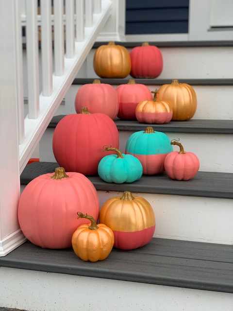 I used a combination of white, black and orange pumpkins, and I will say that surprisingly, the black ones were the easiest to paint – both white and orange took several coats of paint.