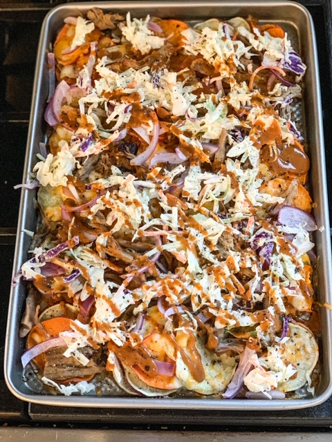 Drizzle Primal Kitchen Golden BBQ Sauce over the top and serve family style! (Pro tip: we ate these with a fork, rather than trying to pick them up like regular nachos. They are pretty heavy!)