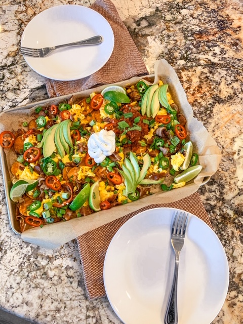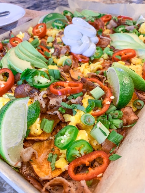 Step 8: Remove nachos from oven and add your scrambled eggs and bacon. Top with jalepeno slices, Fresno chili slices, green onions, cilantro and lime wedges. Add a scoop of sour cream and a scoop of salsa to the pan, and enjoy family style!