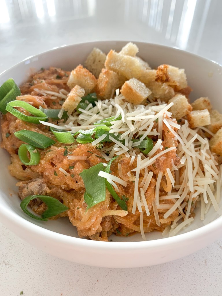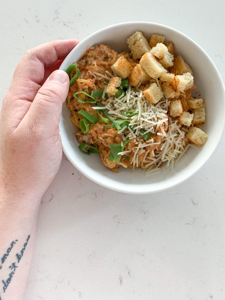 We’re using spaghetti squash as the base for this recipe, but you can totally use regular spaghetti instead if that’s your thing.