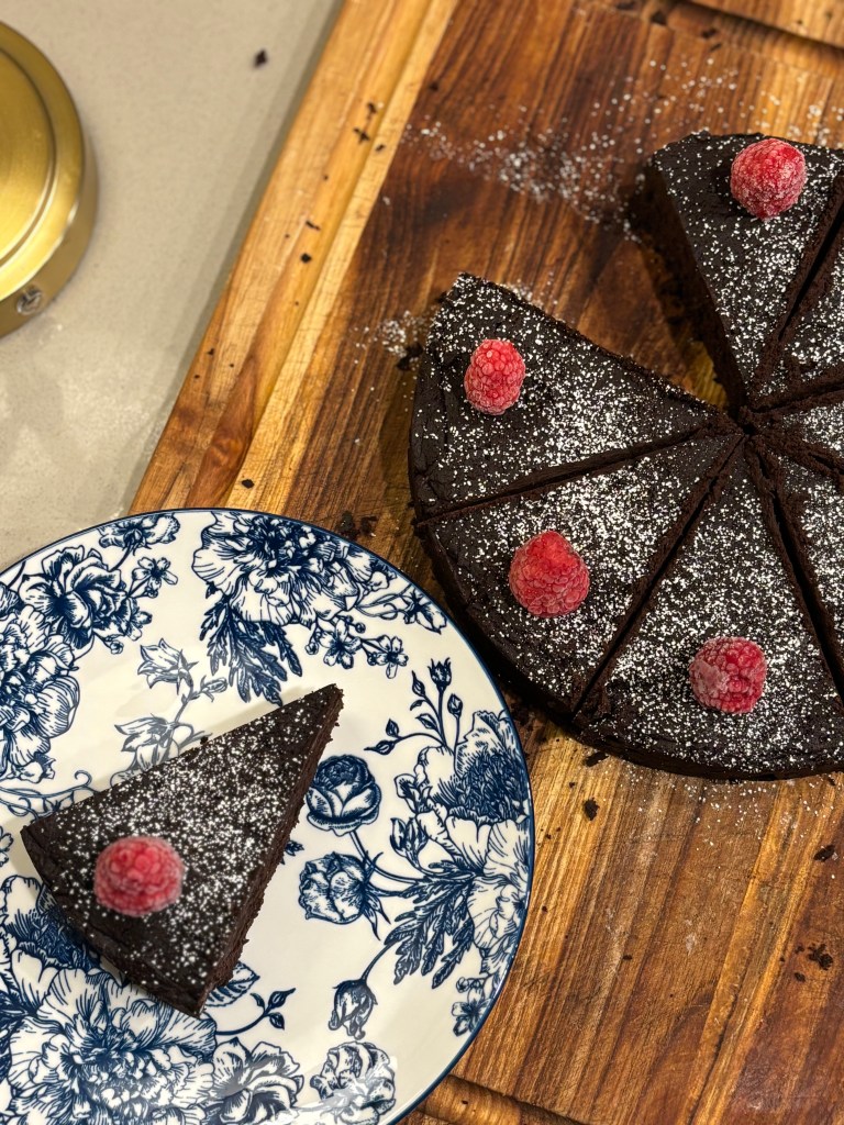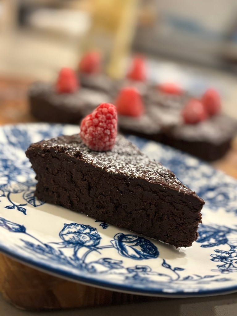 It’ll be a slightly sweet, dense cake with a rich truffle-like interior and a dark chocolate intensity.